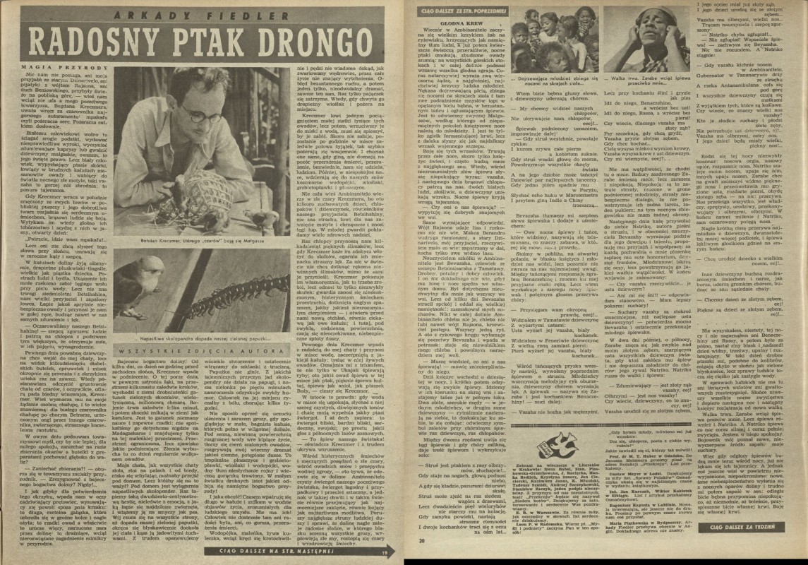 Archiwum / Proza nr 76 (38/1946) 07/10 Podziel się Tytuł Radosny ptak Drongo Autor Arkady Fiedler Kategoria Proza Artykuł z numeru 76 (38/1946) Data wydania 22 września 1946 Tagi powieść Madagaskar Bohdan Kreczmer