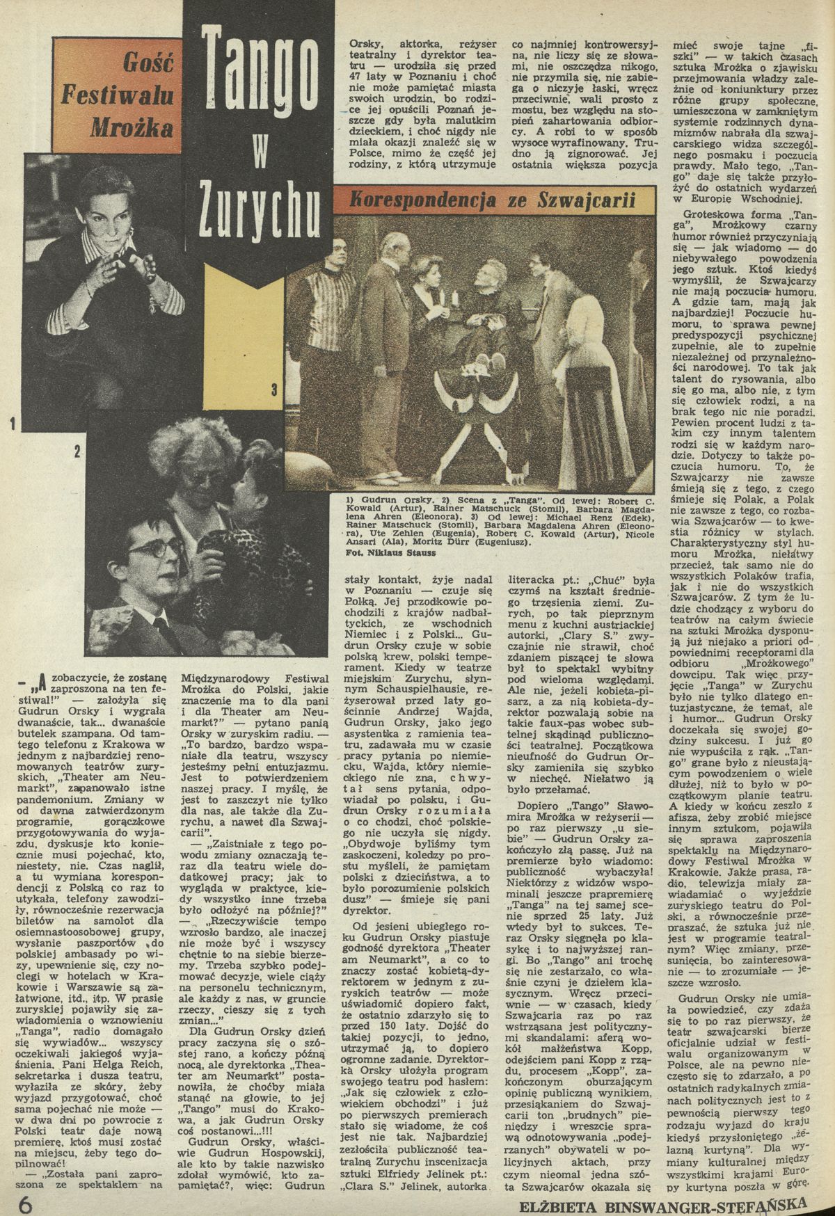 Archiwum / korespondencja własna "Przekroju" nr 2348 (23/1990) 07/183 Podziel się Tytuł Tango w Zurychu Autor Elżbieta Stefańska-Binswanger Rubryka korespondencja własna "Przekroju" Artykuł z numeru 2348 (2349/1990) Data wydania 24 czerwca 1990 Tagi Mrożek Sławomir