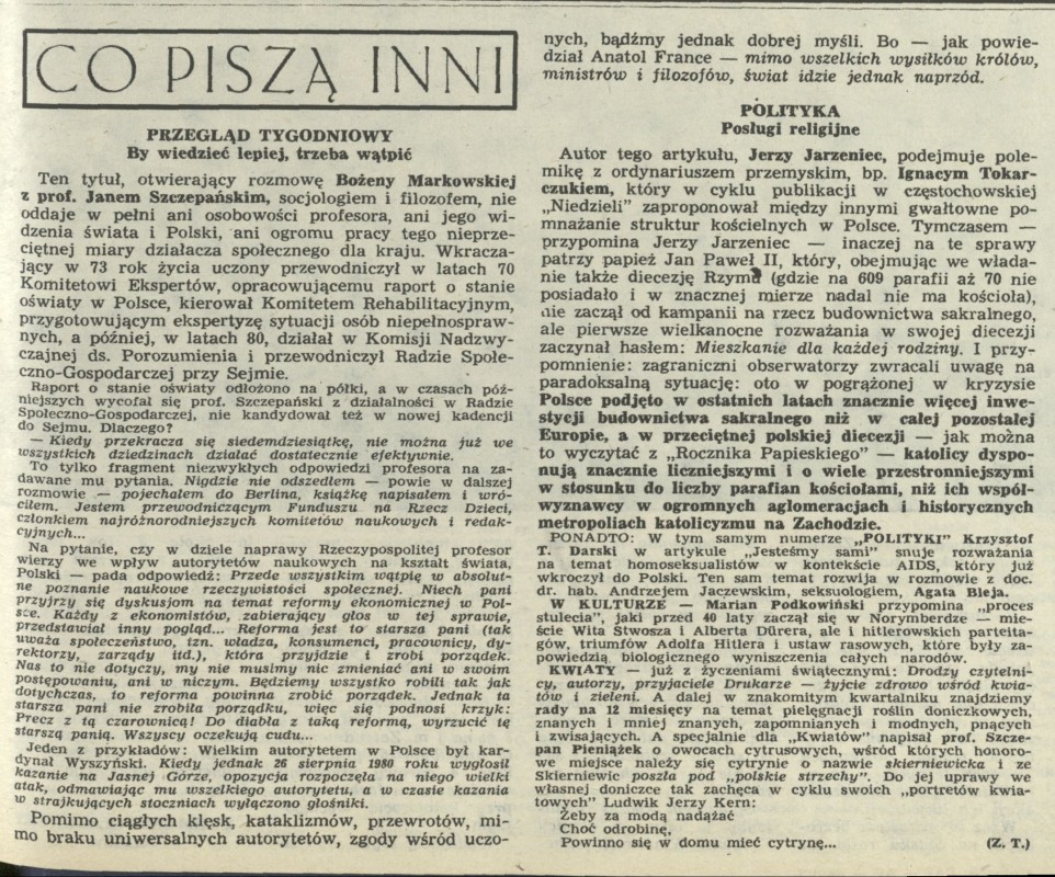 Archiwum / Co piszą inni nr 2112 (48/1985) 1086/1160 Podziel się Tytuł Co piszą inni Rubryka Co piszą inni Artykuł z numeru 2112 (48/1985) Data wydania 25 listopada 1985 Tagi Szczepański bp.Tokarczuk AIDS Norymberga