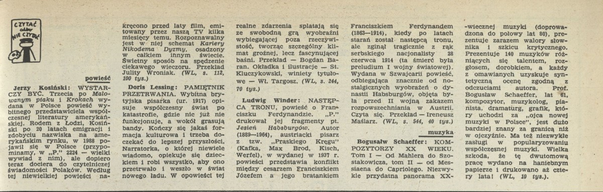 Archiwum / Czytać albo nie czytać? nr 2376 (23/1991) 98330/123969 Podziel się Tytuł Czytać albo nie czytać Rubryka Czytać albo nie czytać? Artykuł z numeru 2376 (2377/1991) Data wydania 6 stycznia 1991