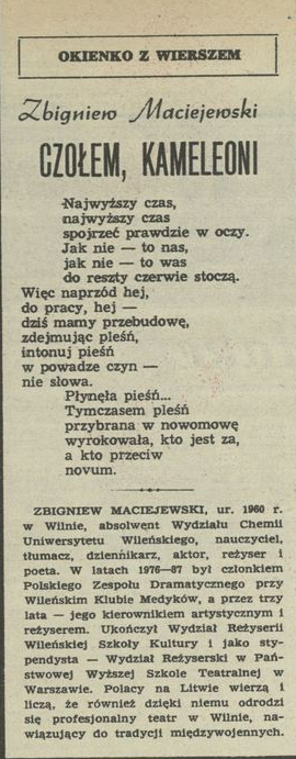 Archiwum / Okienko z wierszem nr 2388 (23/1991) 350/396 Podziel się Tytuł Czołem, kameleoni Autor Zbigniew Maciejerowski Rubryka Okienko z wierszem Artykuł z numeru 2388 (2389/1991) Data wydania 31 marca 1991 Tagi wiersz pieśń