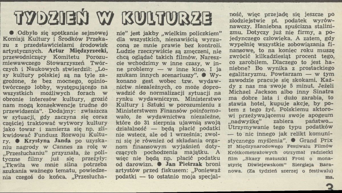 Archiwum / Tydzień w kulturze nr 2346 (23/1990) 139/2632 Podziel się Tytuł Tydzień w kulturze Autor ms Rubryka Tydzień w kulturze Artykuł z numeru 2346 (2347/1990) Data wydania 10 czerwca 1990 Tagi Artur Międzyrzecki