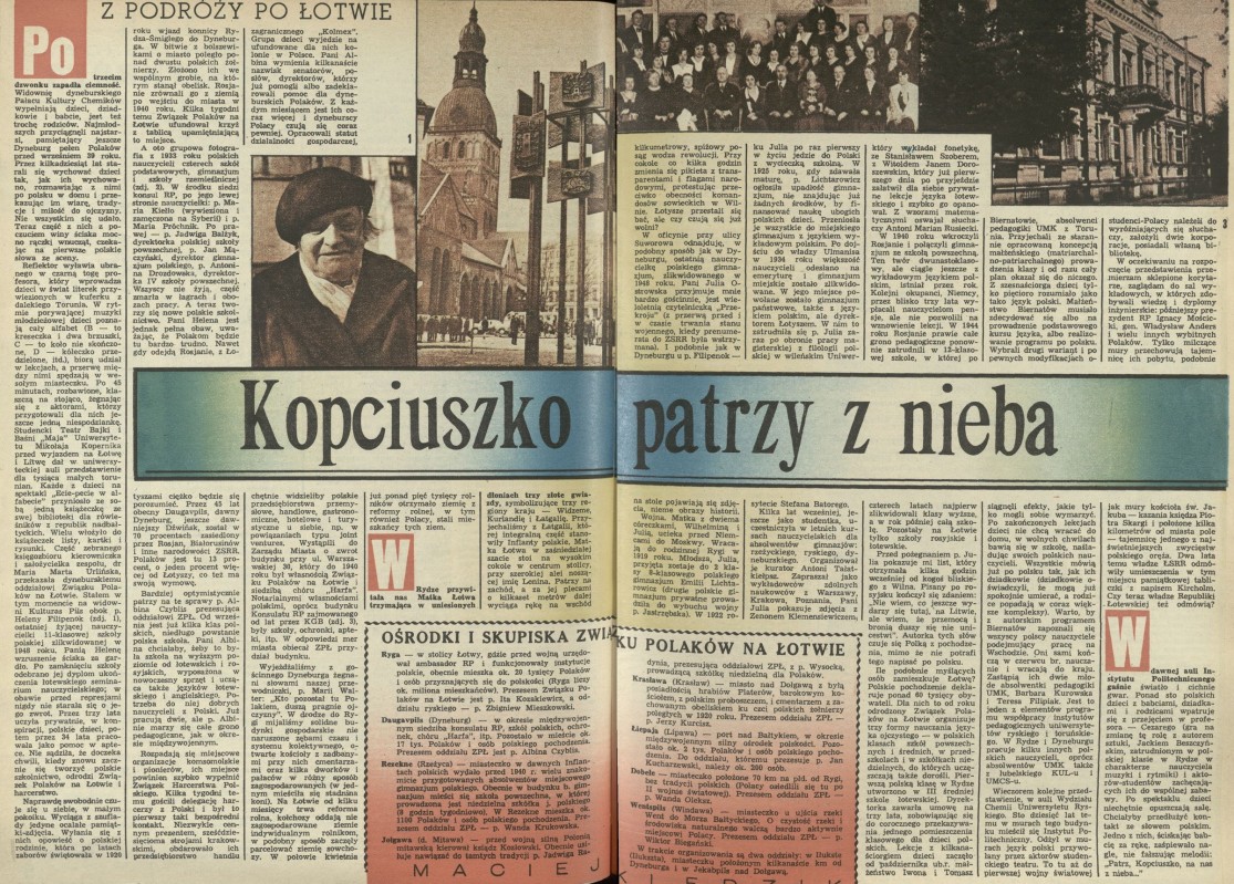Archiwum / korespondencja własna "Przekroju" nr 2342 (23/1990) 6/7 Podziel się Tytuł Kopciuszko patrzy z nieba Autor Maciej Kledzik Rubryka korespondencja własna "Przekroju" Artykuł z numeru 2342 (2343/1990) Data wydania 13 maja 1990 Tagi Łotwa Pałac Kultury Chemików