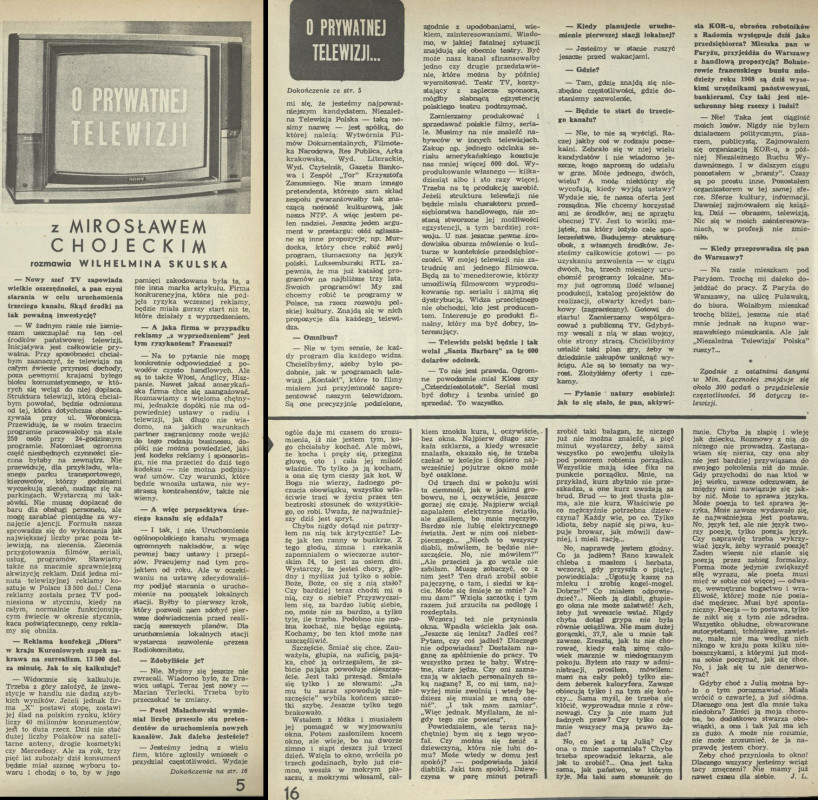 Archiwum / Wywiad nr 2384 (23/1991) 20/108 Podziel się Tytuł O prywatnej telewizji Autor Wilhelmina Skulska Kategoria Wywiad Artykuł z numeru 2384 (2385/1991) Data wydania 3 marca 1991 Tagi Mirosław Chojecki