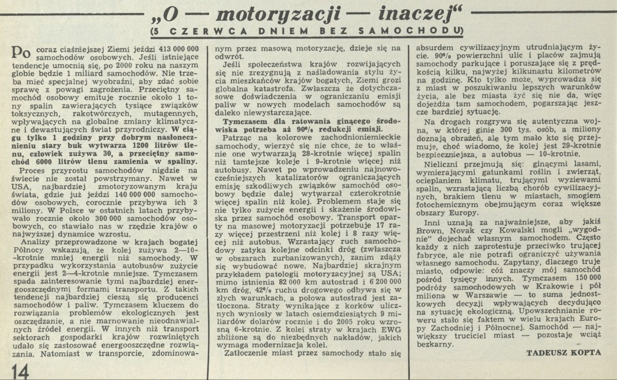 Archiwum / Artykuł nr 2398 (23/1991) 99262/123969 Podziel się Tytuł O motoryzacji inaczej Autor Tadeusz Kopta Kategoria Artykuł Artykuł z numeru 2398 (2399/1991) Data wydania 9 czerwca 1991 Tagi dzień bez samochodu motoryzacja