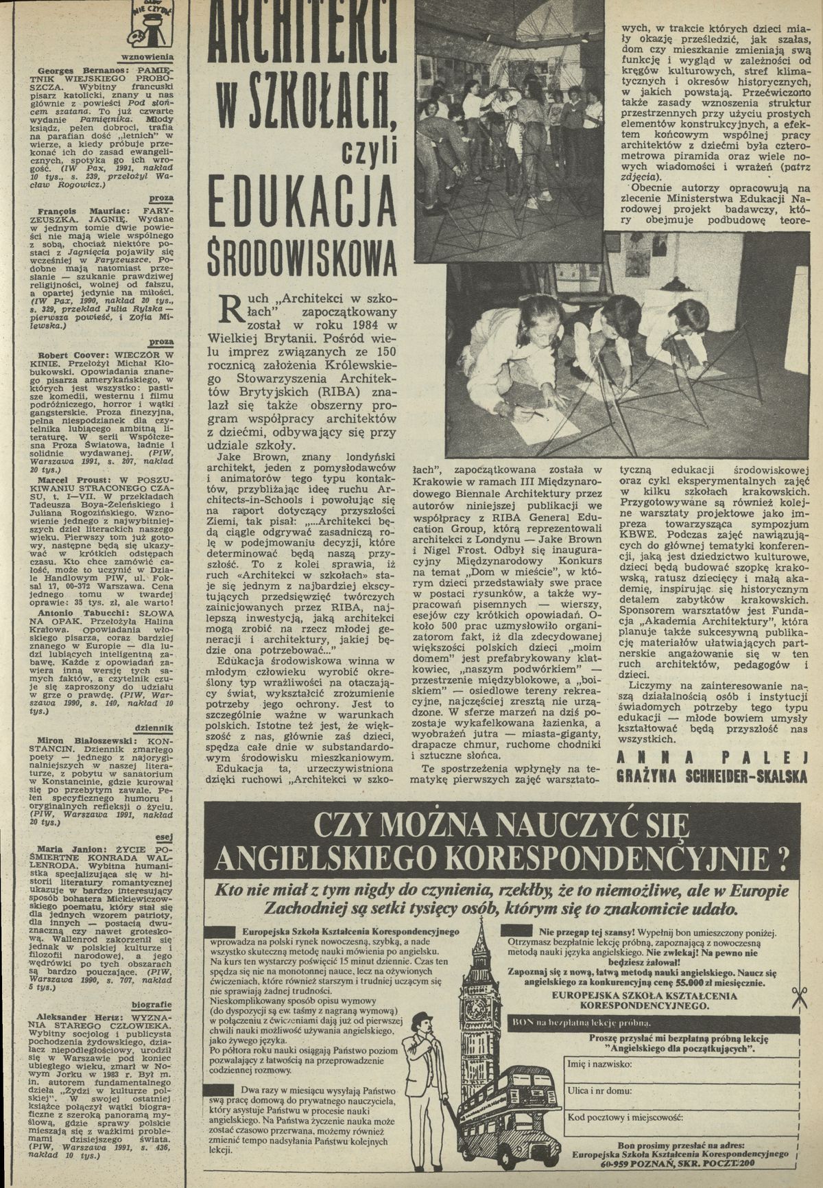 Archiwum / Artykuł nr 2389 (23/1991) 30/98 Podziel się Tytuł Architekci w szkołach czyli edukacja środowiskowa Autor Anna Palej Kategoria Artykuł Artykuł z numeru 2389 (2390/1991) Data wydania 7 kwietnia 1991