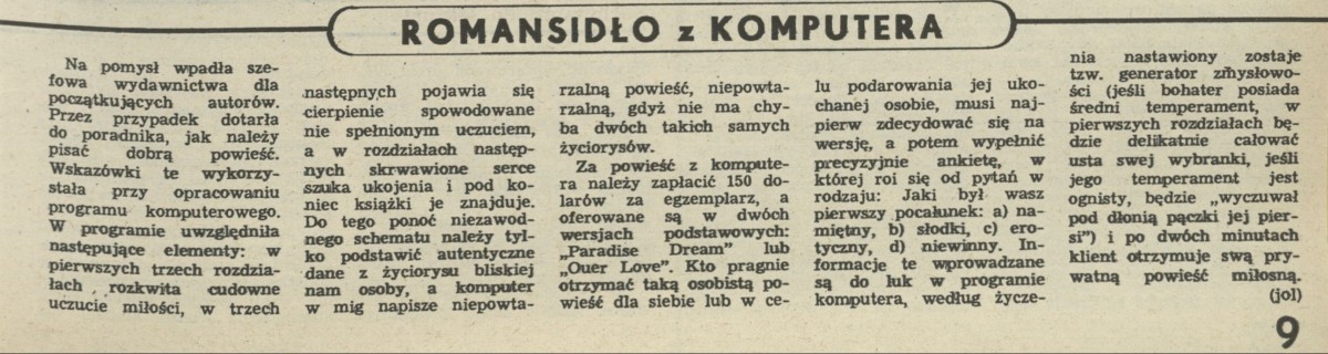 Archiwum / Artykuł nr 2344 (23/1990) 05/105 Podziel się Tytuł Romansidło z komputera Autor jol Kategoria Artykuł Artykuł z numeru 2344 (2345/1990) Data wydania 27 maja 1990 Tagi literatura