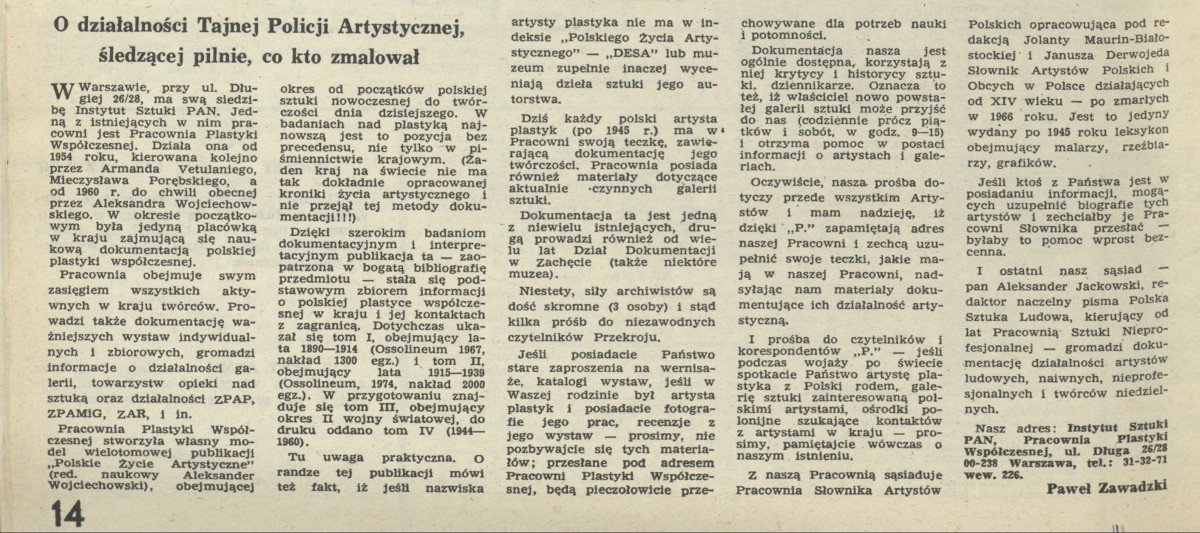 Archiwum / Artykuł nr 2344 (23/1990) 96774/123969 Podziel się Tytuł O działalności tajnej policji artystycznej Autor Paweł Zawadzki Kategoria Artykuł Artykuł z numeru 2344 (2345/1990) Data wydania 27 maja 1990 Tagi sztuka