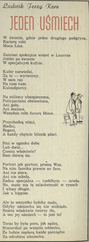 Archiwum / Rozmaitości [old] nr 2344 (23/1990) 23/340 Podziel się Tytuł Jeden uśmiech Autor Ludwik Jerzy Kern Rubryka Rozmaitości [old] Artykuł z numeru 2344 (2345/1990) Data wydania 27 maja 1990