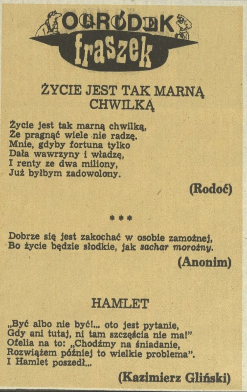 Archiwum / Fraszki nr 2338 (23/1990) 09/13 Podziel się Tytuł Ogródek fraszek Autor Rodoć Kazimierz Gliński Rubryka Fraszki Artykuł z numeru 2338 (2339/1990) Data wydania 15 kwietnia 1990 Tagi życie hamlet