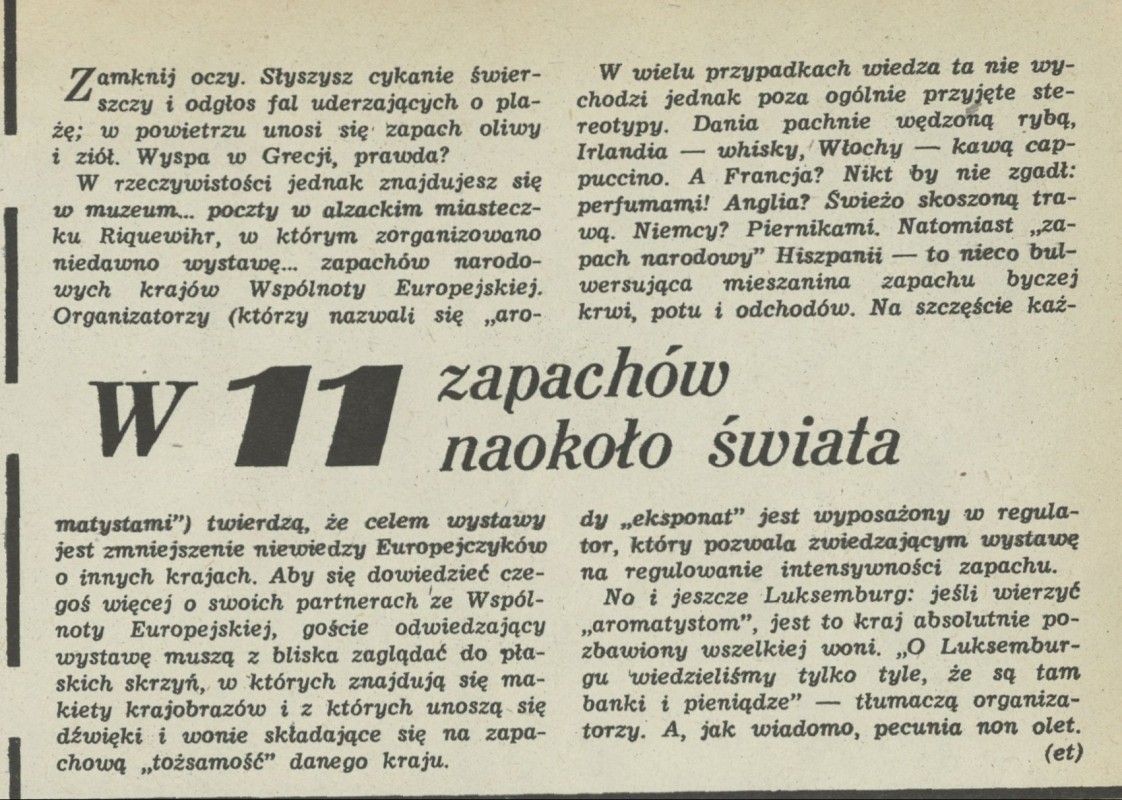 Archiwum / Naokoło świata nr 2353 (23/1990) 97174/123969 Podziel się Tytuł W 11 zapachów naokoło świata Autor et Rubryka Naokoło świata Artykuł z numeru 2353 (2354/1990) Data wydania 29 lipca 1990 Tagi zapachy podróże
