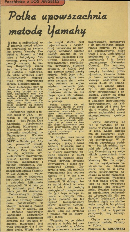 Archiwum / Nauka nr 2382 (23/1991) 2/7 Podziel się Tytuł Polka upowszechnia metodę Yamahy Autor Zbigniew K. Rogowski Kategoria Nauka Artykuł z numeru 2382 (2383/1991) Data wydania 17 lutego 1991