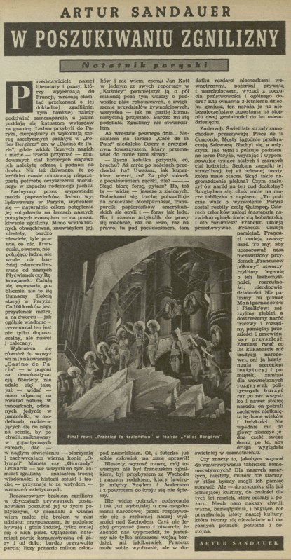 Archiwum / korespondencja własna "Przekroju" nr 88 (50/1946) 65/1682 Podziel się Tytuł W poszukiwaniu zgnilizny Autor Artur Sandauer Rubryka korespondencja własna "Przekroju" Artykuł z numeru 88 (50/1946) Data wydania 15 grudnia 1946 Tagi Paryż notatnik paryski Artur Sandauer