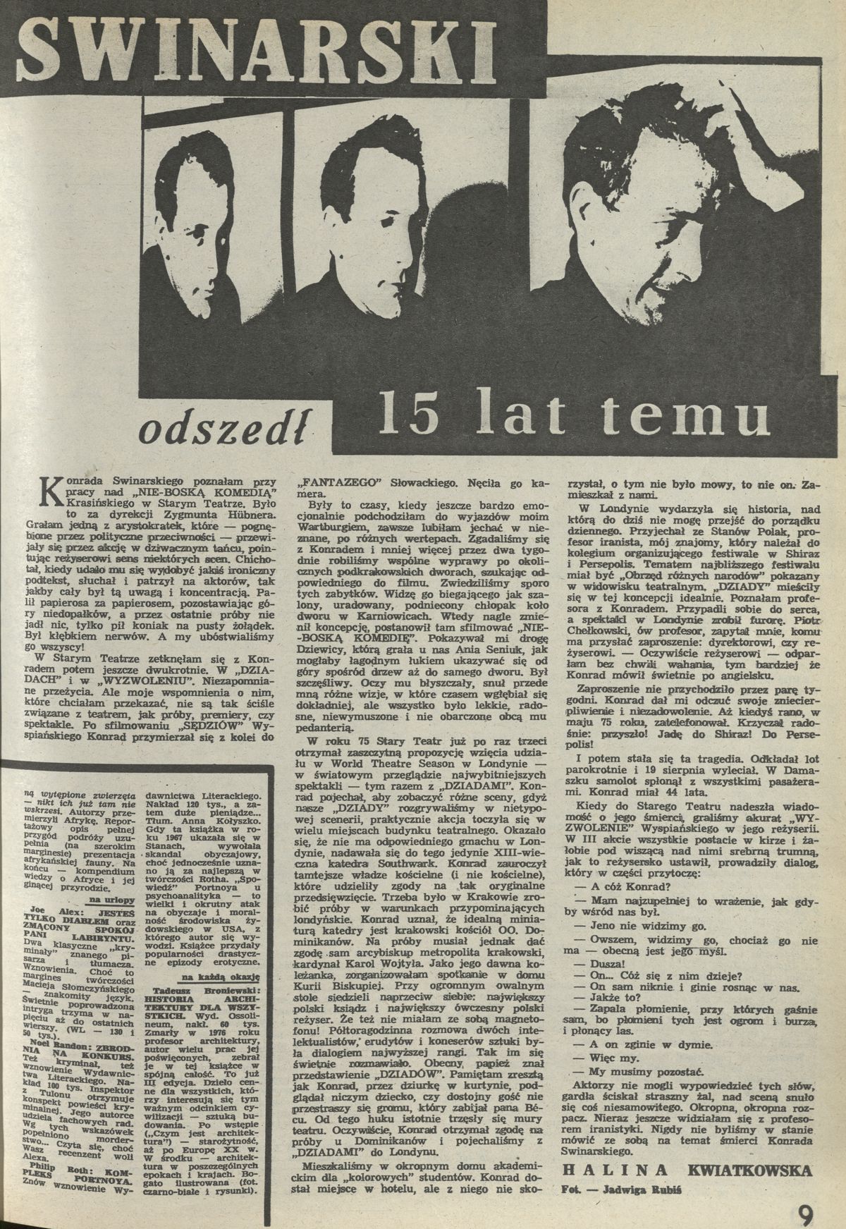 Archiwum / Kultura nr 2356 (23/1990) 184/2632 Podziel się Tytuł Swinarski odszedł 15 lat temu Autor Halina Kwiatkowska Kategoria Kultura Artykuł z numeru 2356 (2357/1990) Data wydania 19 sierpnia 1990 Tagi Konrad Swinarski teatr Dziady Nie-boska komedia