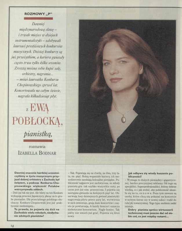 Archiwum / Rozmowy „Przekroju” nr 2811 (28/1999) 2/2 Podziel się Tytuł Rozmowa z Ewą Pobłocką Autor Izabella Bodnar Rubryka Rozmowy „Przekroju” Artykuł z numeru 2811 (2812/1999) Data wydania 9 maja 1999 Tagi pianistka wirtuoz
