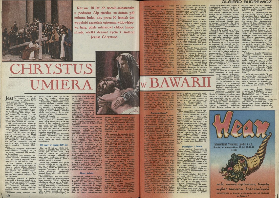 Archiwum / Kultura nr 2357 (23/1990) 118/122 Podziel się Tytuł Chrystus umiera w Bawarii Autor Olgierd Budrewicz Kategoria Kultura Artykuł z numeru 2357 (2358/1990) Data wydania 26 sierpnia 1990 Tagi Jezus Chrystus Bawaria pasja męka Chrystusa