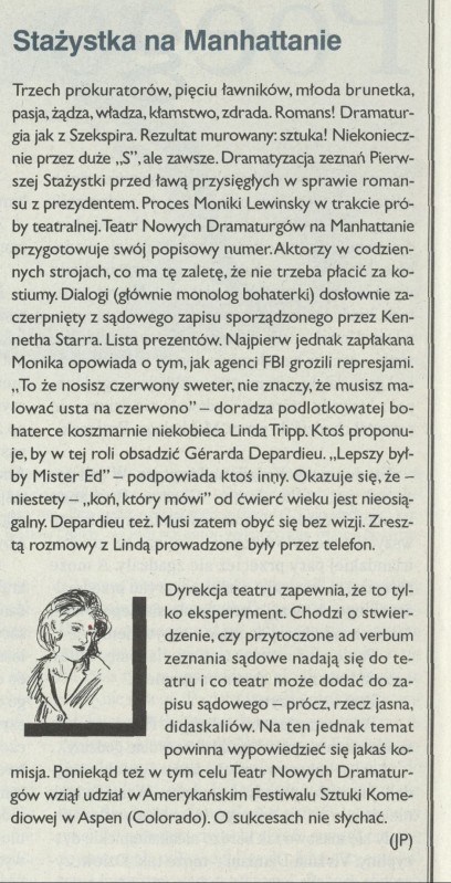 Archiwum / Relacja nr 2811 (28/1999) 1264/1281 Podziel się Tytuł Stażystka na Manhattanie Kategoria Relacja Artykuł z numeru 2811 (2812/1999) Data wydania 9 maja 1999 Tagi Monika Lewinsky