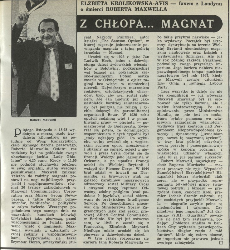 Archiwum / korespondencja własna "Przekroju" nr 2421 (24/1991) 100314/123969 Podziel się Tytuł Z chłopa... magnat Autor Elżbieta Królikowska-Avis Rubryka korespondencja własna "Przekroju" Artykuł z numeru 2421 (2422/1991) Data wydania 17 listopada 1991 Tagi Robert Maxwell