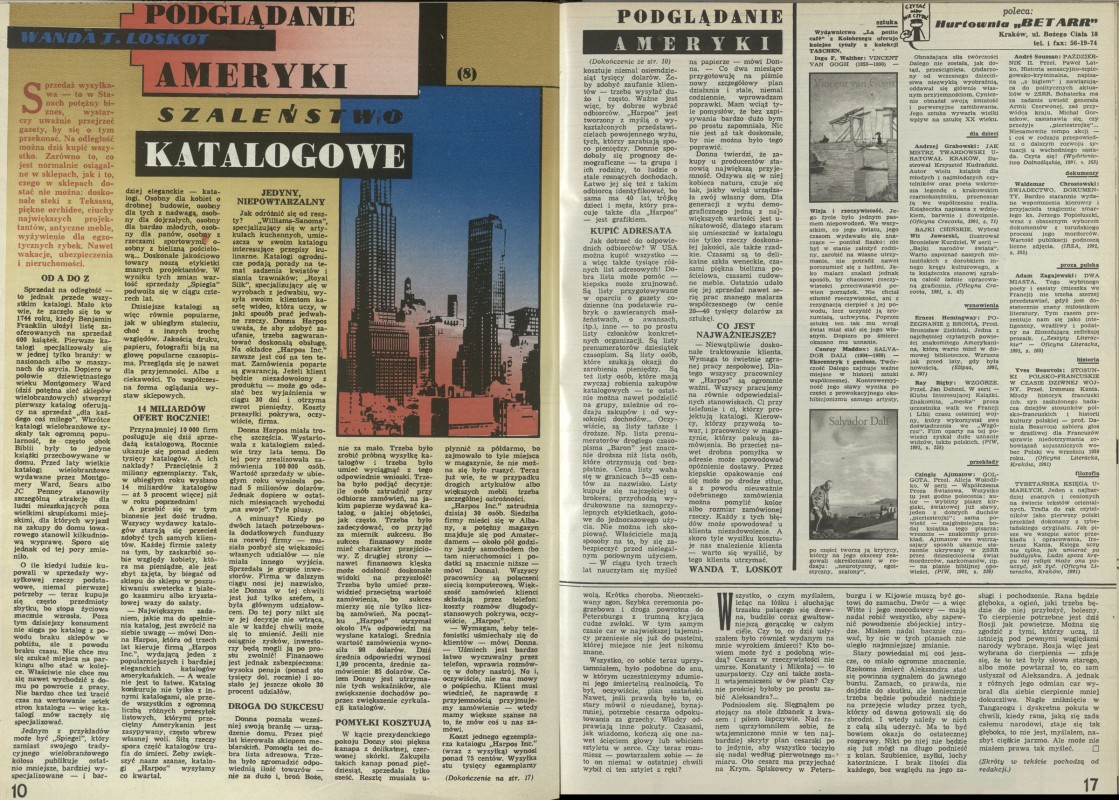 Archiwum / Społeczeństwo nr 2418 (24/1991) 100186/123969 Podziel się Tytuł Szaleństwo katalogowe Autor Wanda T. Loskot Kategoria Społeczeństwo Artykuł z numeru 2418 (2419/1991) Data wydania 27 października 1991 Tagi Ameryka