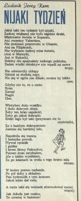 Archiwum / Rozmaitości nr 2393 (23/1991) 79/322 Podziel się Tytuł Nijaki tydzień Autor Ludwik Jerzy Kern Rubryka Rozmaitości Artykuł z numeru 2393 (2394/1991) Data wydania 5 maja 1991 Tagi wiersz łazienka