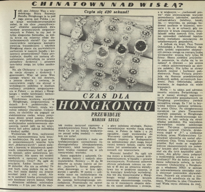 Archiwum / Artykuł nr 2364 (23/1990) 08/48 Podziel się Tytuł Czas dla Hongkongu Autor Marian Szulc Kategoria Artykuł Artykuł z numeru 2364 (2365/1990) Data wydania 14 października 1990 Tagi Chiny handel