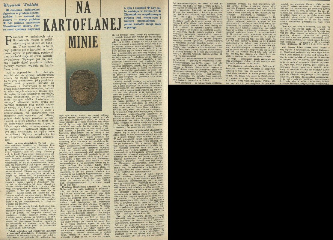 Archiwum / Artykuł nr 2365 (23/1990) 04/74 Podziel się Tytuł Na kartoflanej minie Autor Wojciech Kubicki Kategoria Artykuł Artykuł z numeru 2365 (2366/1990) Data wydania 21 października 1990 Tagi rolnictwo ekonomia ziemniaki