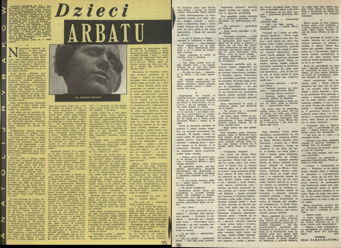 Archiwum / Proza nr 2183 (15/1987) 5/8 Podziel się Tytuł Dzieci Arbatu Autor Anatolij Rybakow Ałła Sarachanowa Kategoria Proza Artykuł z numeru 2183 (15/1987) Data wydania 12 kwietnia 1987 Tagi literatura rosyjska młodzież