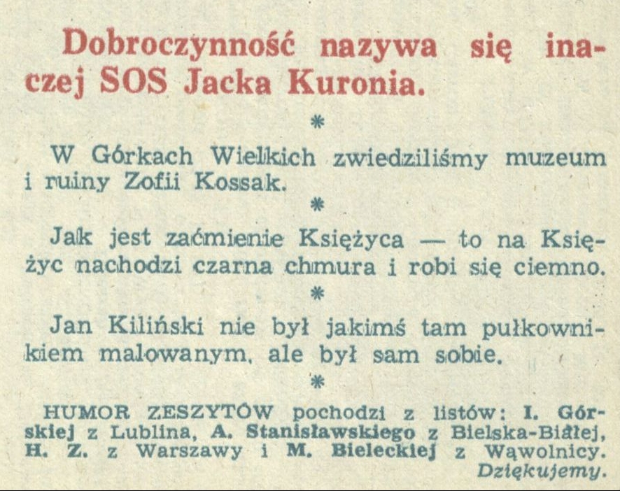 Archiwum / Humor zeszytów szkolnych nr 2367 (23/1990) 34/41 Podziel się Tytuł Humor zeszytów Rubryka Humor zeszytów szkolnych Artykuł z numeru 2367 (2368/1990) Data wydania 4 listopada 1990 Tagi humor zeszytów