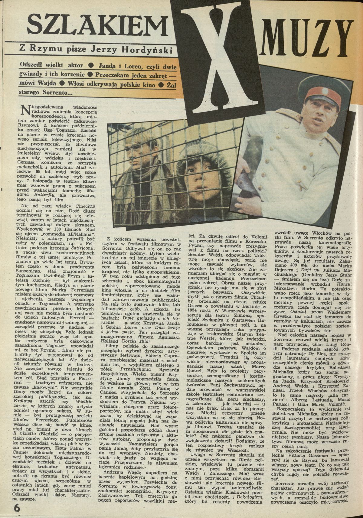 Archiwum / korespondencja własna "Przekroju" nr 2370 (23/1990) 226/271 Podziel się Tytuł Szlakiem X Muzy Autor Jerzy Hordyński Rubryka korespondencja własna "Przekroju" Artykuł z numeru 2370 (2371/1990) Data wydania 25 listopada 1990 Tagi X Muza kino Krystyna Janda Sophia Loren Rzym film
