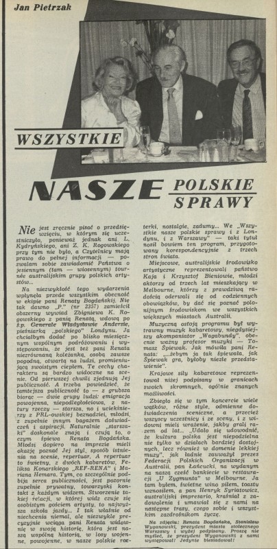 Archiwum / Społeczeństwo nr 2370 (23/1990) 200/2546 Podziel się Tytuł Wszystkie nasze polskie sprawy Autor Jan Pietrzak Kategoria Społeczeństwo Artykuł z numeru 2370 (2371/1990) Data wydania 25 listopada 1990 Tagi Renata Bogdańska REF-RENA
