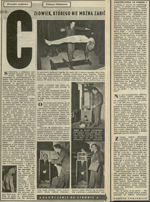 Archiwum / Reportaż nr 144 (02/1948) 1033/1815 Podziel się Tytuł Człowiek, którego nie można zabić Autor Tadeusz Unkiewicz Kategoria Reportaż Artykuł z numeru 144 (2/1948) Data wydania 11 stycznia 1948