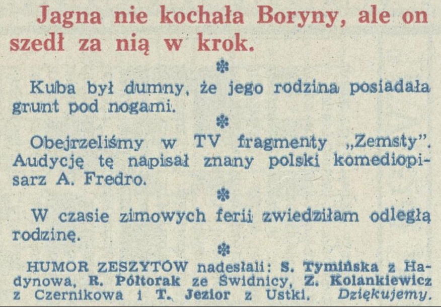 Archiwum / Humor zeszytów szkolnych nr 2370 (23/1990) 35/38 Podziel się Tytuł Humor zeszytów Rubryka Humor zeszytów szkolnych Artykuł z numeru 2370 (2371/1990) Data wydania 25 listopada 1990 Tagi humor zeszytów