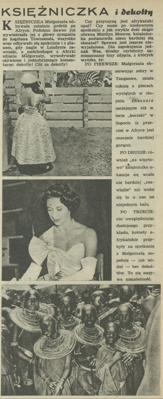 Archiwum / Różności nr 608 (49/1956) 154/2310 Podziel się Tytuł Księżniczka i dekolty Kategoria Różności Artykuł z numeru 608 (49/1956) Data wydania 2 grudnia 1956 Tagi księżniczka Małgorzata Tanganika Afryka