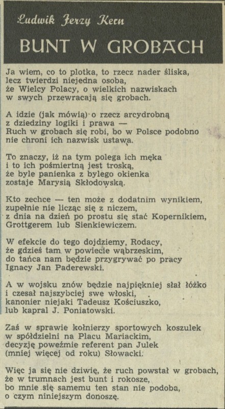 Archiwum / Rozmaitości [old] nr 608 (49/1956) 160/2310 Podziel się Tytuł Bunt w grobach Autor Ludwik Jerzy Kern Rubryka Rozmaitości [old] Artykuł z numeru 608 (49/1956) Data wydania 2 grudnia 1956 Tagi wiersz