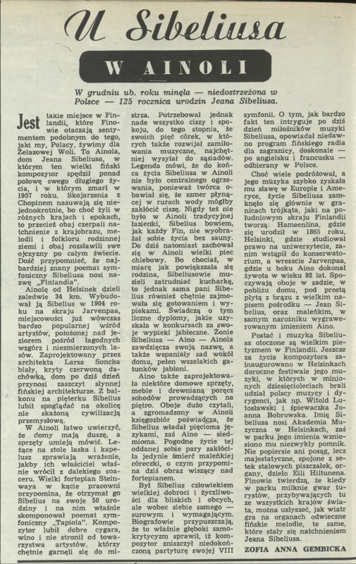 Archiwum / Artykuł nr 2392 (23/1991) 68/190 Podziel się Tytuł U Sibeliusa w Ainoli Autor Zofia Anna Gembicka Kategoria Artykuł Artykuł z numeru 2392 (2393/1991) Data wydania 28 kwietnia 1991 Tagi Jean Sibelius