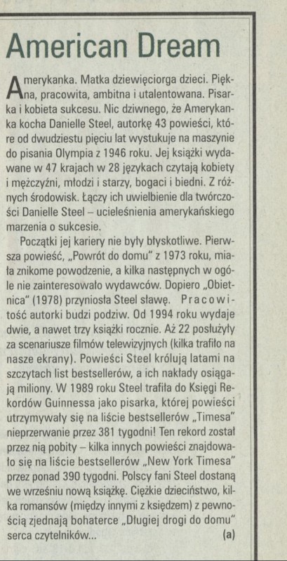 Archiwum nr 2779 (27/1998) 119758/123969 Podziel się Tytuł American Dream Artykuł z numeru 2779 (2780/1998) Data wydania 27 września 1998 Tagi Danielle Steel