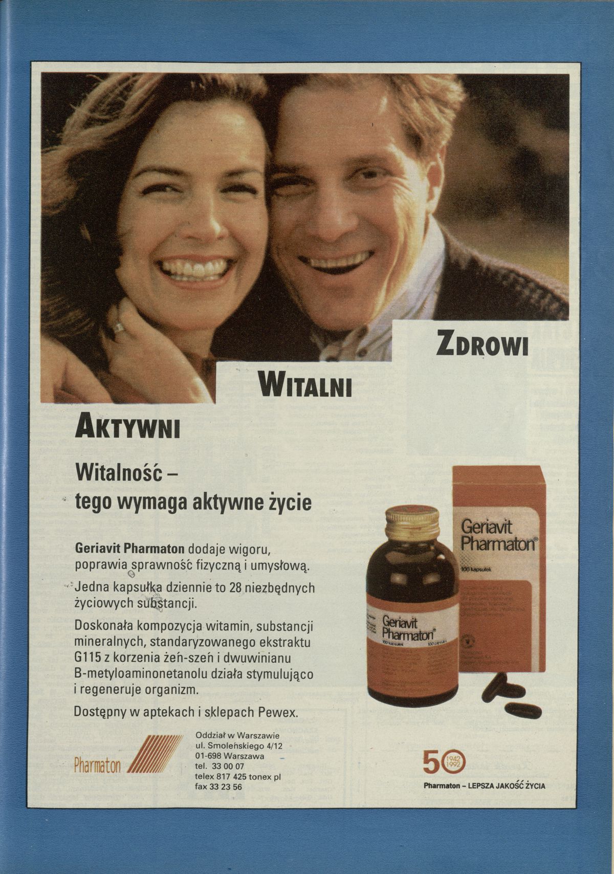 Archiwum / Reklamy nr specjalny 2468/1992 102606/123969 Podziel się Tytuł Geriavit Pharmaton Rubryka Reklamy Artykuł z numeru nr specjalny 2468/1992 Data wydania 4 października 1992