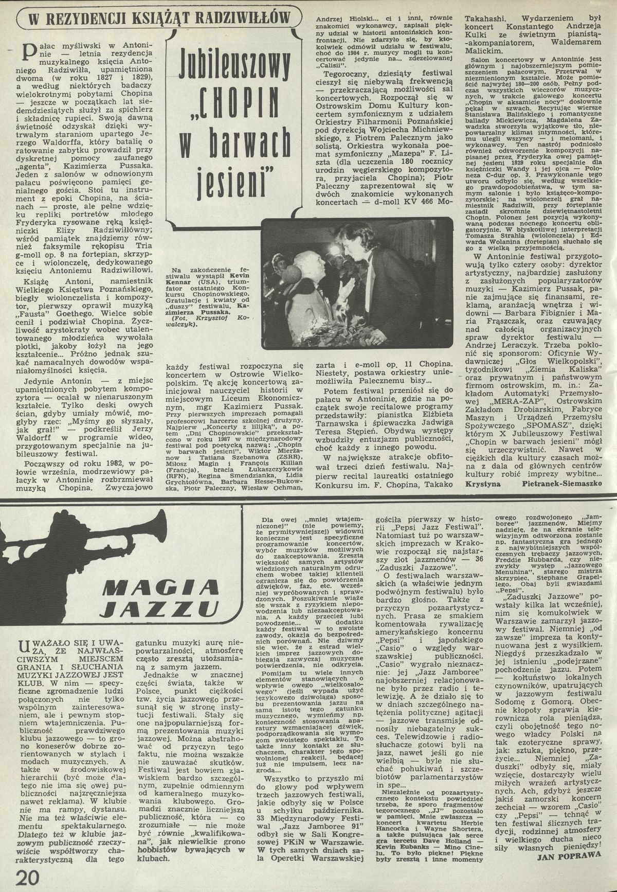 Archiwum / Kultura nr 2422 (24/1991) 100384/123969 Podziel się Tytuł Jubileuszowy „Chopin w barwach jesieni” Autor Krystyna Pietranek-Siemaszko Kategoria Kultura Artykuł z numeru 2422 (2423/1991) Data wydania 24 listopada 1991 Tagi Fryderyk Chopin