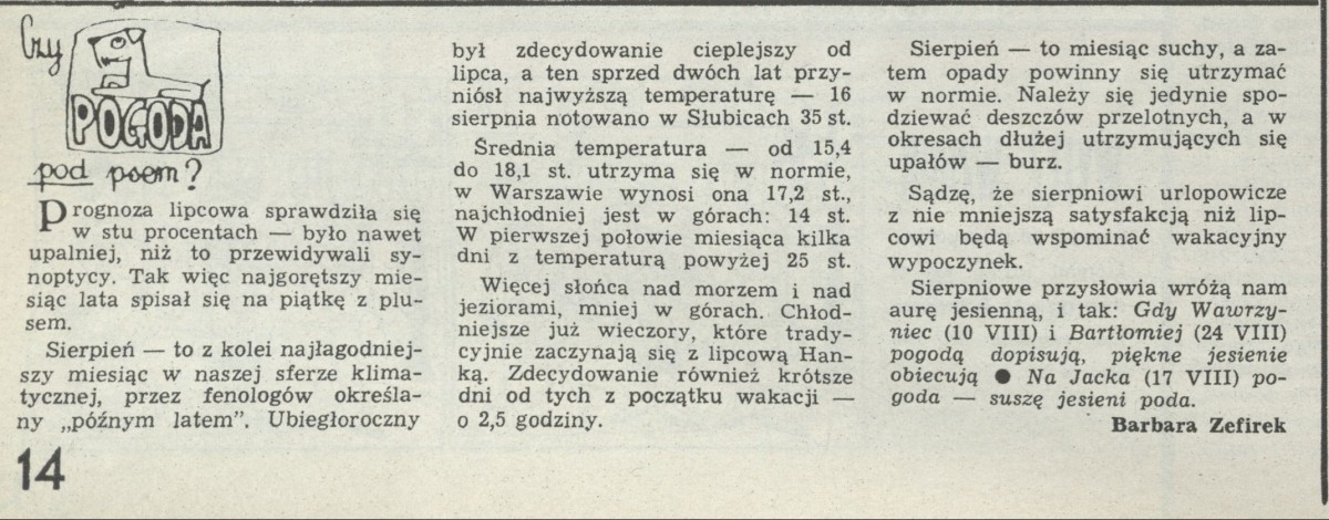 Archiwum / Czy pogoda pod psem? nr 2406 (24/1991) 162/289 Podziel się Tytuł Czy pogoda pod psem? Autor Barbara Zefirek Rubryka Czy pogoda pod psem? Artykuł z numeru 2406 (2407/1991) Data wydania 4 sierpnia 1991