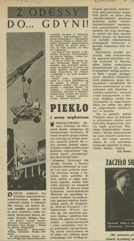 Archiwum / Komentarz nr 372 (21/1952) 09/23 Podziel się Tytuł Z Odessy do... Gdyni! / Piekło i urna wyborcza Autor Czesław Komarnicki Kategoria Komentarz Artykuł z numeru 372 (21/1952) Data wydania 25 maja 1952