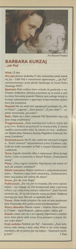 Archiwum / Teatr nr 2797 (27/1999) 2233/2277 Podziel się Tytuł Barbara Kurzaj...Jak Piaf Autor Tomasz Zieja Rubryka Teatr Artykuł z numeru 2797 (2798/1999) Data wydania 31 stycznia 1999