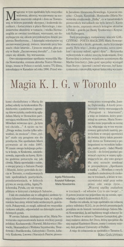 Archiwum / Recenzja nr 2797 (27/1999) 01/16 Podziel się Tytuł Magia K.I.G. w Toronto Autor Kira Gałczyńska Kategoria Recenzja Artykuł z numeru 2797 (2798/1999) Data wydania 31 stycznia 1999 Tagi Teatr Słowackiego Maria Nowotarska "Zaczarowana dorożka"