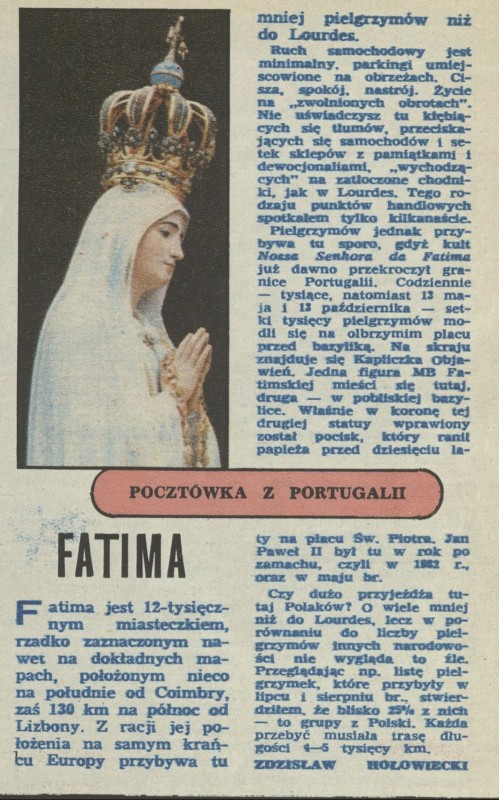 Archiwum / Korespondencja nr 2416 (24/1991) 53/443 Podziel się Tytuł Pocztówka z Portugalii. Fatima Autor Zdzisław Hołowiecki Kategoria Korespondencja Artykuł z numeru 2416 (2417/1991) Data wydania 13 października 1991