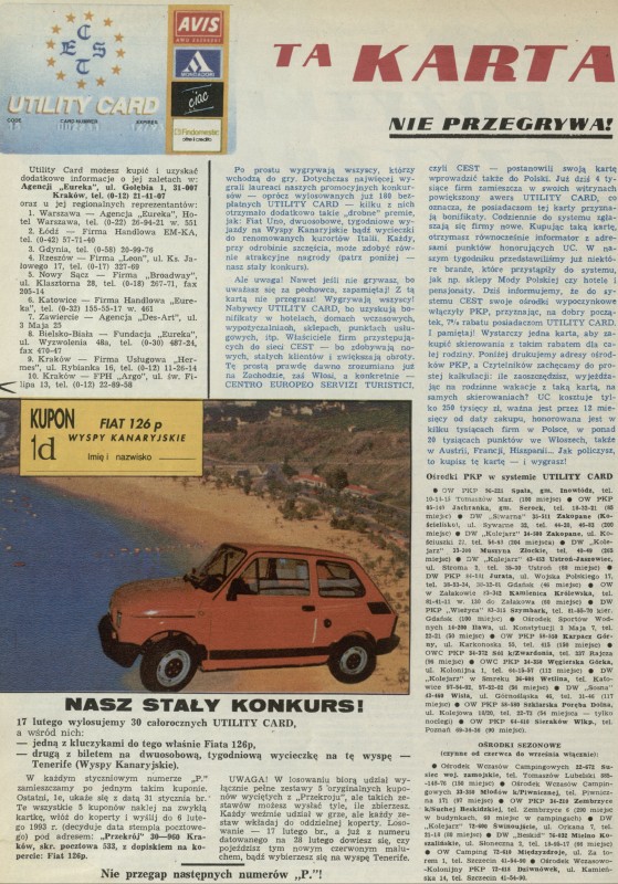 Archiwum / Reklamy nr 2483 (04/1993) 20552/123969 Podziel się Tytuł Ta karta nie przegrywa! Rubryka Reklamy Artykuł z numeru 2483 (4/1993) Data wydania 24 stycznia 1993 Tagi Fiat 126p Utility Card