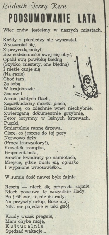Archiwum / Rozmaitości [old] nr 2416 (24/1991) 100121/123969 Podziel się Tytuł Podsumowanie lata Autor Ludwik Jerzy Kern Rubryka Rozmaitości [old] Artykuł z numeru 2416 (2417/1991) Data wydania 13 października 1991 Tagi wiersz wakacje