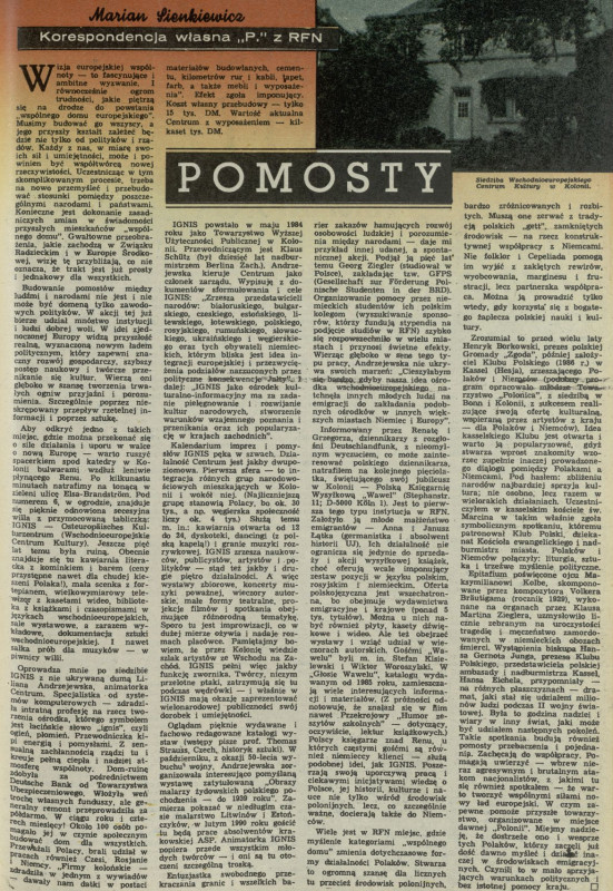 Archiwum / korespondencja własna "Przekroju" nr 2319 (47/1989) 2/5 Podziel się Tytuł Pomosty Autor Marian Sienkiewicz Rubryka korespondencja własna "Przekroju" Artykuł z numeru 2319 (47/1989) Data wydania 3 grudnia 1989 Tagi kultura gromada zgoda polska europa budowa