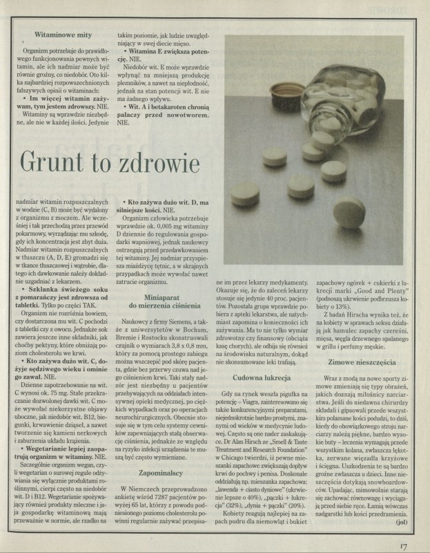 Archiwum / Artykuł nr 2796 (27/1999) 120882/123969 Podziel się Tytuł Grunt to zdrowie Kategoria Artykuł Artykuł z numeru 2796 (2797/1999) Data wydania 31 stycznia 1999