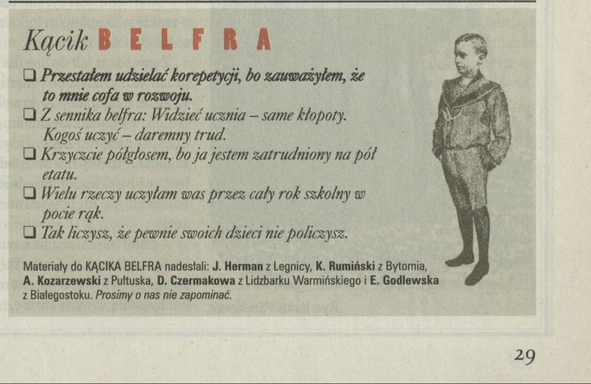 Archiwum nr 2796 (27/1999) 120897/123969 Podziel się Tytuł Kącik belfra Artykuł z numeru 2796 (2797/1999) Data wydania 31 stycznia 1999 Tagi korepetycje