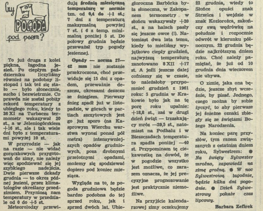 Archiwum / Czy pogoda pod psem? nr 2217 (49/1987) 72/90 Podziel się Tytuł Czy pogoda pod psem? Autor Barbara Zefirek Rubryka Czy pogoda pod psem? Artykuł z numeru 2217 (49/1987) Data wydania 6 grudnia 1987 Tagi pogoda meteorologia