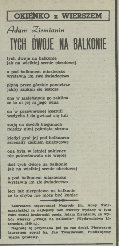 Archiwum / Okienko z wierszem nr 2320 (48/1989) 138/138 Podziel się Tytuł Tych dwoje na balkonie Autor Adam Ziemianin Rubryka Okienko z wierszem Artykuł z numeru 2320 (48/1989) Data wydania 10 grudnia 1989